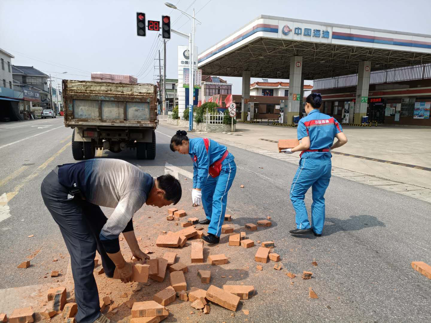 夏天的中午,天氣炎熱,似乎連樹上的知了也停止了歌唱。華東銷售南通公司栟茶加油站站前道路,似乎和往常一樣,車輛人流來(lái)來(lái)往往,當(dāng)班的繆小紅和蔡翠和頂著炎熱在加油島上等待下一個(gè)顧客來(lái)加油。突然,“吱呀~~~”一個(gè)急剎,一輛避讓行人的運(yùn)磚車差點(diǎn)翻車,晃悠了幾次總算停穩(wěn)了,但是車上的磚塊紛紛滾落。后方行駛的車輛有些來(lái)不及避讓,差點(diǎn)釀成新的事故,散落的磚塊對(duì)道路交通安全構(gòu)成隱患。司機(jī)驚魂未定,趕忙下車查看,立刻開(kāi)始將散落在道路上的磚往車上搬。