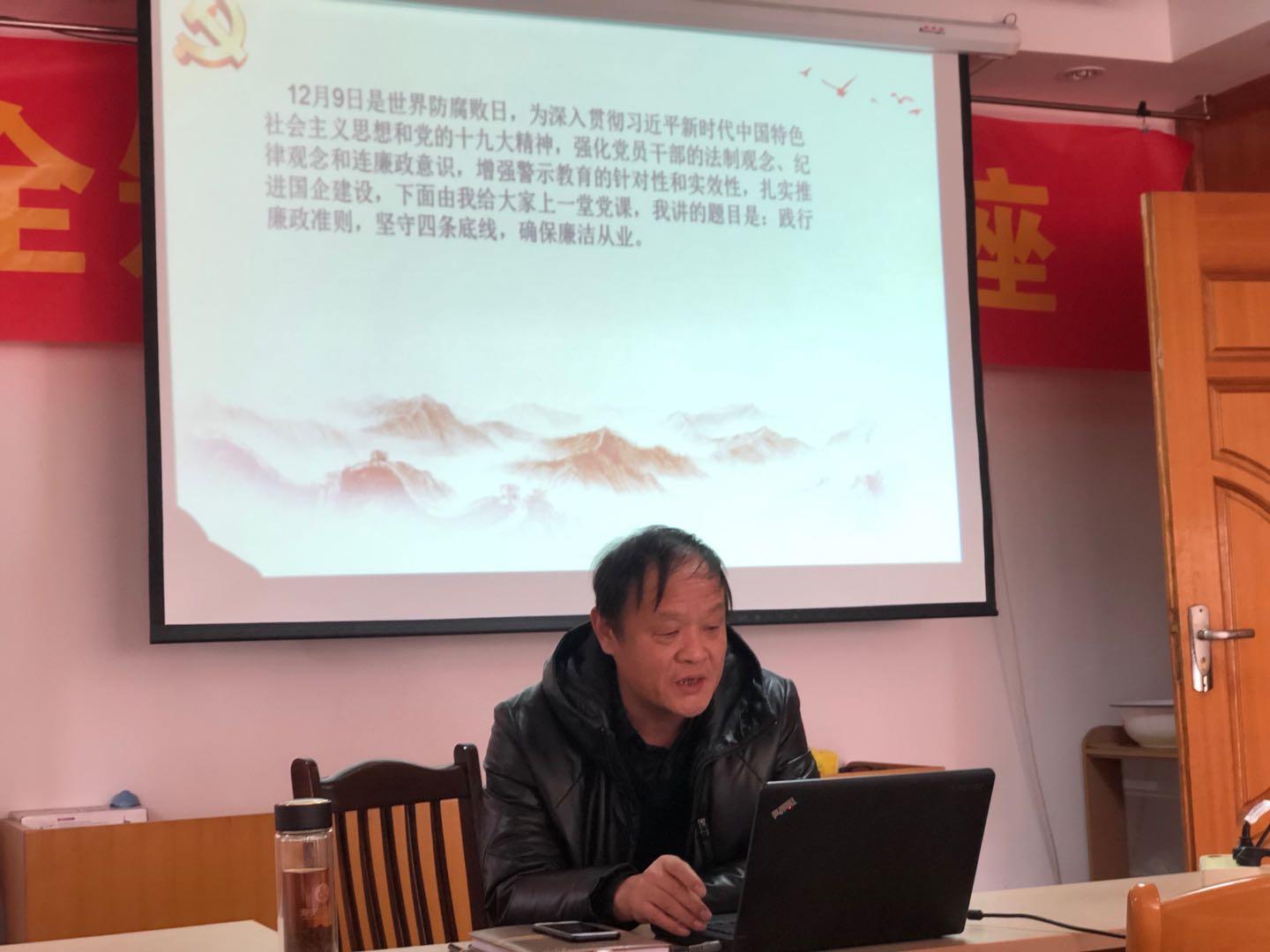 本次活動由黨支部書記劉志清主持會議,活動包括三項(xiàng)議程,首先由黨支部書記劉志清給全體黨員上黨課,課程重溫了《廉政準(zhǔn)則》,警醒全體黨員樹立正確的人生觀、價值觀、世界觀,防微杜漸。提出了堅(jiān)守四條底線,警示黨員干部堅(jiān)決不做違法的事,一定不做違紀(jì)的事,拒絕去做誘惑的事,認(rèn)真去做盡責(zé)的事。然后,通過觀看警示教育片,讓黨員干部吸取教訓(xùn),引以為戒。最后,召開專題組織生活會,圍繞警示教育專題進(jìn)行了批評與自我批評。 劉志清書記給全體黨員提出了以下要求:一是正確對待權(quán)力,處理好權(quán)與法的關(guān)系、權(quán)與情的關(guān)系、權(quán)與義的關(guān)系、權(quán)與利的關(guān)系;二是要做到“四個不”,不失志、不失職、不失節(jié)、不失蹄,主動學(xué)習(xí)黨的路線方針、政策,增強(qiáng)理論知識的深入研究,按規(guī)矩辦事,管住自我、遵紀(jì)守法,拒腐防變,堅(jiān)定共產(chǎn)主義理想信念不動搖。 本次警示專題活動,鞏固了我公司黨風(fēng)廉政建設(shè)工作的良好局面,推動我公司黨風(fēng)廉政建設(shè)和反腐敗工作取得新成效。 |